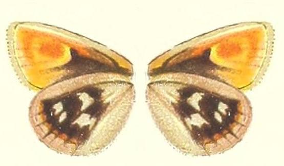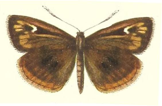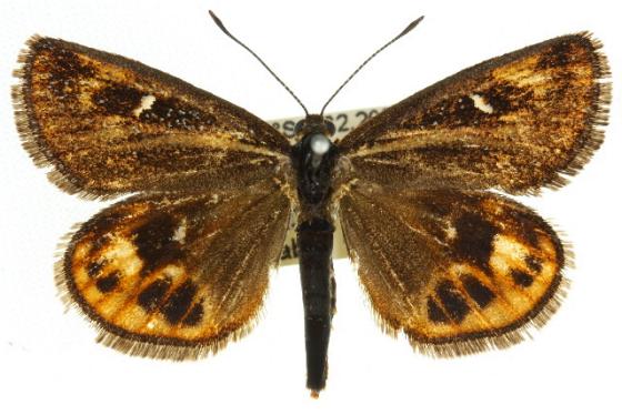 The hindwings are dark brown with orange markings. The wingspan is about 3.5 cms.