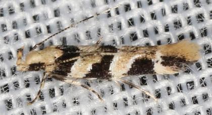 This moth is off-white with four black bands on each forewing. The white areas have brownish patches. The moths have a wingspan of about 0.8 cm.