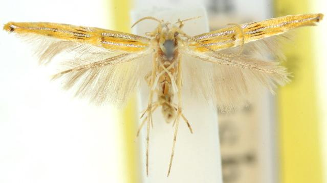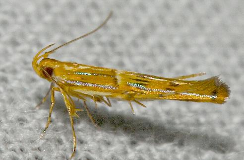 This moth is golden brown with some narrow iridescent streaks on the forewings. The moths have a wingspan of about 1 cm.