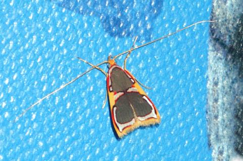 The adult moth of this species has brown forewings with white markings edged in rusty red, and a gold costa and margin. The hindwings are white. The wingspan is about 2 cms. The moth has very long antennae, which span about 4 cms.