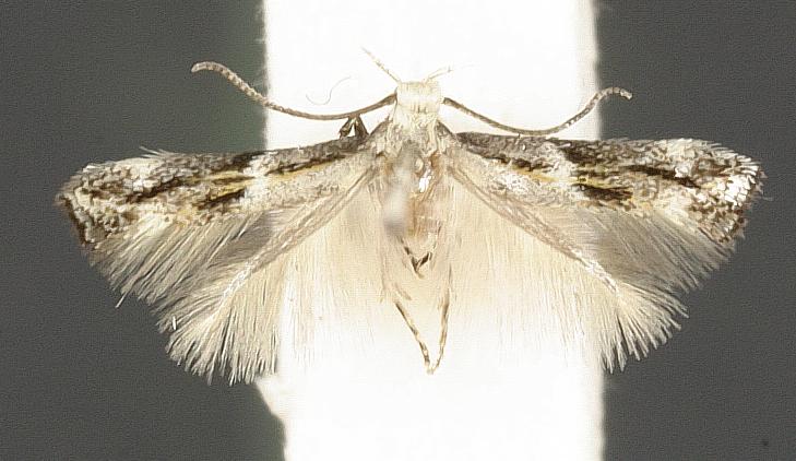 The adult male moths of this species have grey forewings, each with some black and yellow markings, and also a white band across the middle of the wing, a bisected white submarginal band, and a vague white spot near the middle of the outer margina. The hindwings are grey. The head and neck tuft are white. The female moths are similar but darker. The moths have a wingspan of about 0.6 cm.