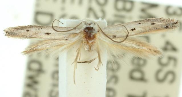 The adult moths of this species have off-white speckled forewings, each with several dark spots. The moths have a wingspan of about 0.6 cm.