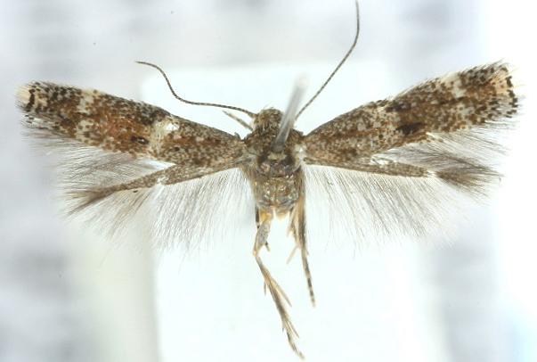 The adult moths of this species have brown speckled wings, each crossed by two vague dark-edged pale bands, and the forewings each have a similar band along the margin. The moths have a wingspan of about 0.6 cm.