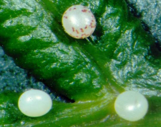 The eggs are spherical and white, developing red markings as hatching approaches.