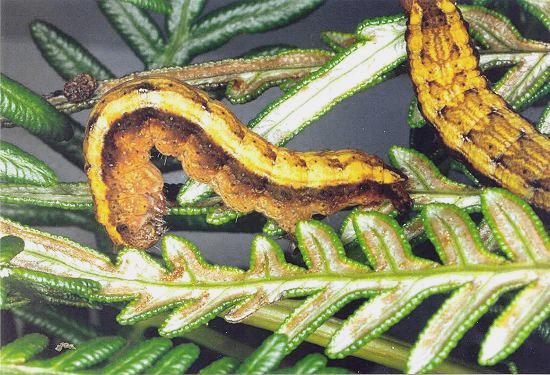 These caterpillars are brown with a yellow stripe along each side and dark markings. The feed on :