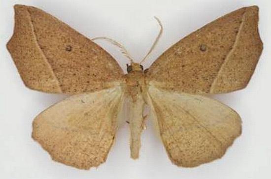 The adult moth is pale brown with a pale submarginal stripe, and sometimes a dark spot near the middle of each forewing. The forewings have hooktips and a marginal cusp. The wingspan is about 3 cms.