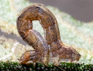 It has an orange-brown head with dark markings. The caterpillar has lost three pairs of prolegs, so walks in a looper fashion.
