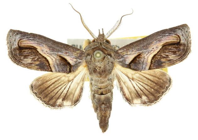 The adult moths are brown with forewings that each have a pattern like half of a crescent. The hindwings are each brown with dark veins, and with a double pale patch by the tornus.
