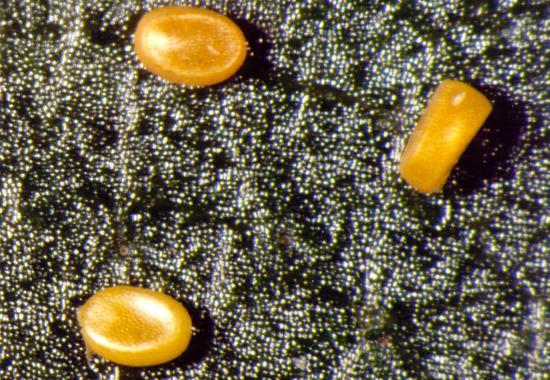 The eggs are round, flattened, and yellow, and covered in minute dimples. They are laid singly.