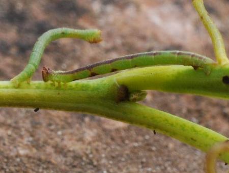 The Caterpillars of this species are green loopers with variable brown markings, and orange between the segments. The caterpillars have a pair of short reddish horns on the head. The caterpillars feed on