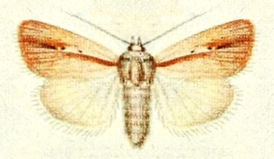 The adult moths of this species have rusty brown forewings, each having a dark streak from base to margin interrupted by a pale spot. The hindwings are off-white darkening towards the margins. The wingspan is about 2.5 cms.