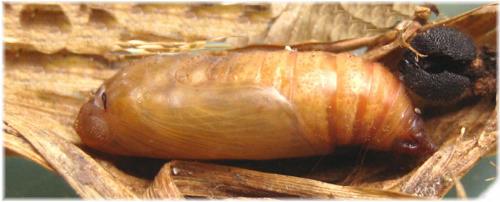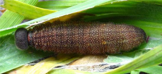 This Caterpillar is brown with a black head. The Caterpillar grows to a length of about 2 cms. It lives by day in a shelter made of a folded leaf joined with silk, feeding at night. It has been found on various grasses (POACEAE) including