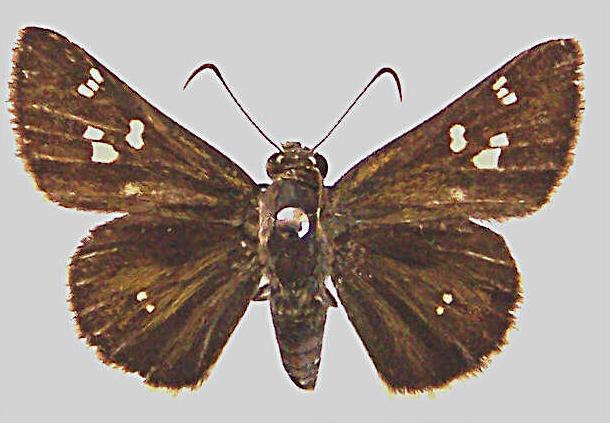 The butterflies of this species are dark brown on top with three sets of pale spots on each forewing and a translucent set of spots on each hindwing.