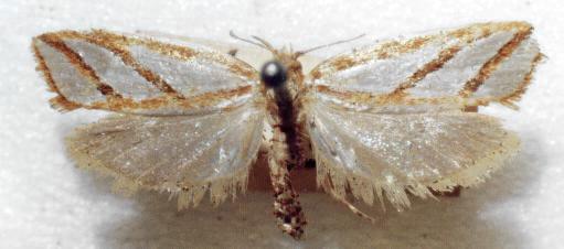 The adult moth has satin white wings, with two brown diagonal stripes and a brown border around each fore wing. The moth has a wingspan of about 2 cms.
