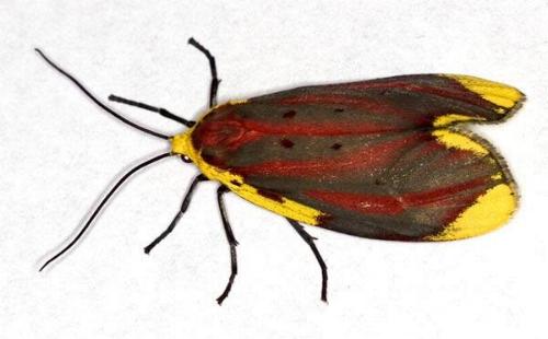 The adult moth has red forewings with dark veins, and with yellow markings along the costa, and at the wingtip and tornus. The hindwings are plain scarlet. The abdomen is also scarlet. The males are rather paler than the females. The wingspan is about 4 cms.