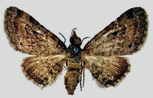 The adult moth of this species has dark brown forewings each with vague darker zig-zag markings, and a dark spot near the middle. The hindwings are dark brown, and are unusually small. The moths have a wingspan of about 2 cms.