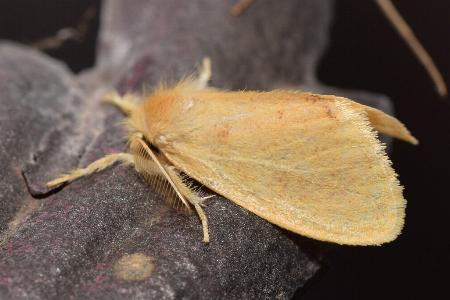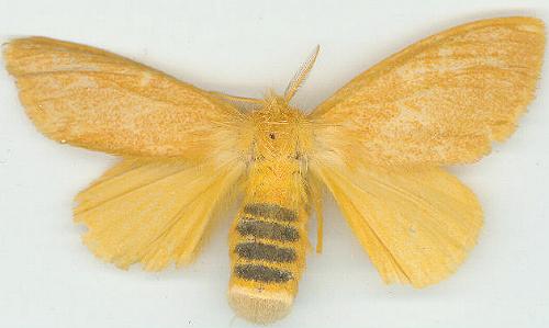 The adult moth of this species is yellow, with black bands across the abdomen. It has a wingspan of about 4 cms.