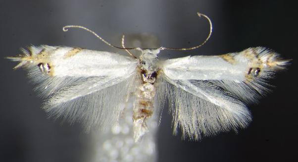 The adult moth has white forewings, each with some black-edged brown marks near the margin, and a black, brown, and white eye-spot at the tornus. The hindwings are white, with long white fringes along the costa. Each of the four wings has long white fringes along the hind-margin. The moth has a wingspan of about 0.8 cms.