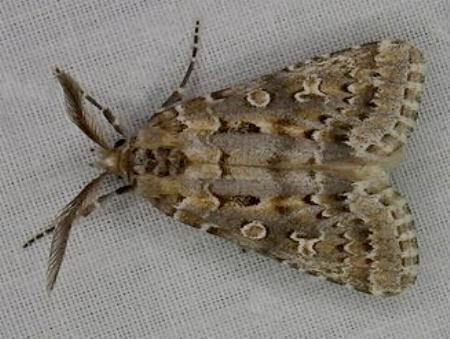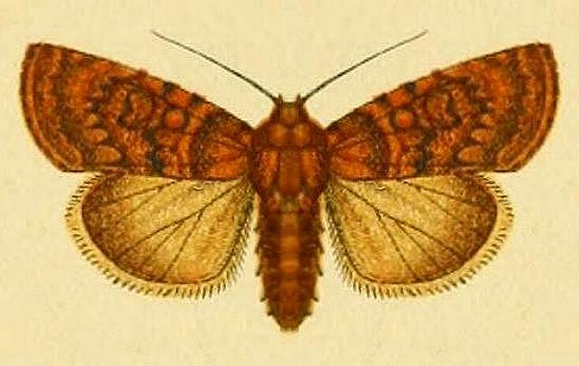 The adult moth has brown forewings each with a complex pattern. The hindwings are brown, fading toward the bases, with dark veins.