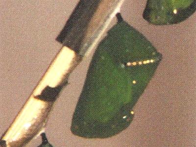 The pupa is green with 10 spots that are initially gold, but later turn to silver, and typically hung by its cremaster to a twig.