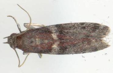 The adult moth is dark brown, with a ragged pale band across each forewing. The wingspan is about 1.5 cms.