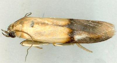 This adult moth has forewings each with a pale brown basal half and a dark brown marginal half, with a dark band across the middle. The hindwings are pale brown fading to white at the bases. The moth has a wingspan of about 2 cms.
