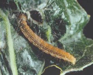 This caterpillar is brown with a number of dark lines along the body. It lives in a loose silken web on a leaf of its foodplant.