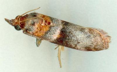 The adult moths of this species have forewings that have bands of orange, white and dark brown. The hindwings are pale grey with reddish edges. Underneath: the wings are dark brown. The moths have a wingspan of about 2 cms.