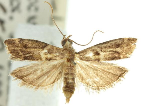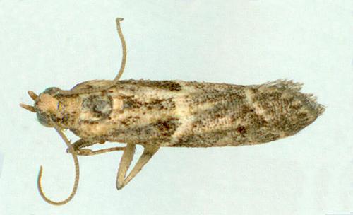 These adult moths are brown with a vague pattern including a pale band across each forewings. The hindwings are plain pale brown. The wingspan is about 1.5 cms.