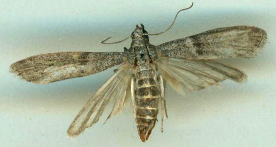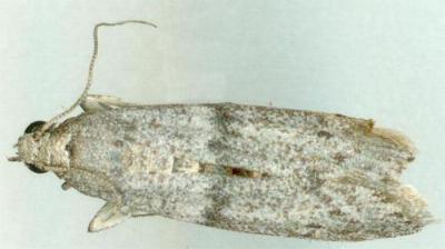 This adult moth has speckled grey forewings each with a dark band across the middle. The hindwings are plain pale grey. The moth has a wingspan of about 1.5 cms.