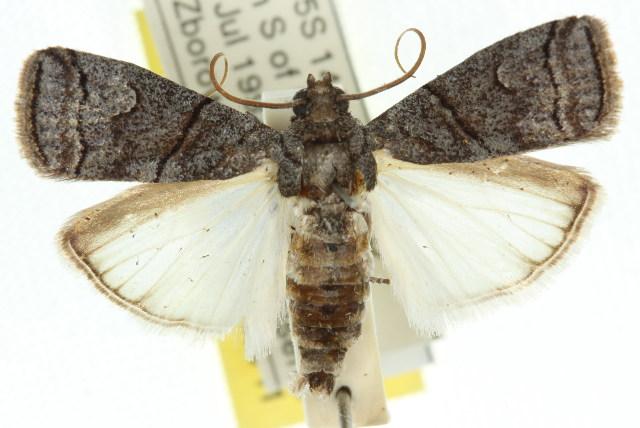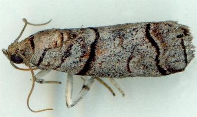 The adult moths have grey forewings, each with a pattern of wavy dark lines. The hindwings are white. The wingspan is about 2.5 cms.