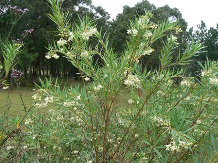 It is a short-lived perennial shrub growing half a metre to 2 metres high. The leaves are mid green, 10 cm long and narrow, and arranged in opposite pairs along the stem. Like other members of the ASCLEPIADACEAE the plant exudes a milky sap if the stem is broken or cut, which contains cardiac glycosides.