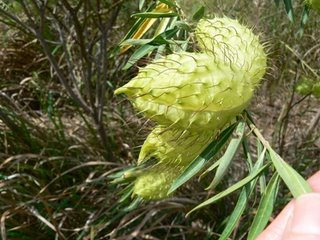 The fruits are the cause of the common names swan plant and cotton bush. Using your imagination one could make a swan out of the bend of the stem and the green seed pod but the cotton bush epithet is more easily understood, because when the fruit splits to disperse the wind borne seeds, they look very much like an open cotton boll. They have no relationship to cotton however.