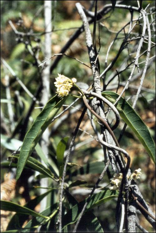 This plant is a twining vine, with ellipical leaves which are about 10 cms long..