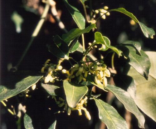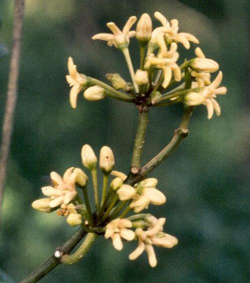 The plant has clusters of cream coloured flowers which are about 1 cm across.