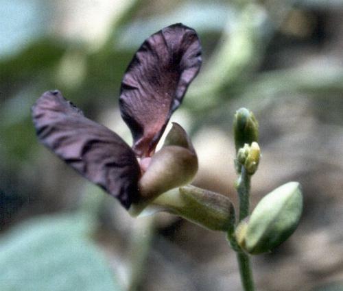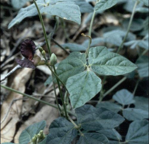 Siratro is a perennial twining plant in the pea family, developing stems up to 3 m long. The leaves have 3 ovate leaflets up to 7 cm long, with the two laterals ones markedly asymmetric, with a lobe on the base. The flowers are borne on slender racemes up to 40 cm long. The typical pea flowers are about 2 cm long and are dark reddish-black. Seed pods are pubescent, up to 10 cm long by 5 mm wide, with about 12 seeds to a pod.