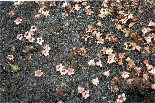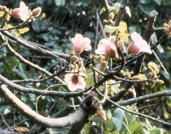 This is a deciduous tree, growing up to 20 metres high. It has 5-lobed leaves, up to 18 cm long. It flowers in summer, when tree is almost leafless. Flowers are pink to red, 6 cm long, with no petals, but sepals are petaloid and coloured, and pubescent on the outside.