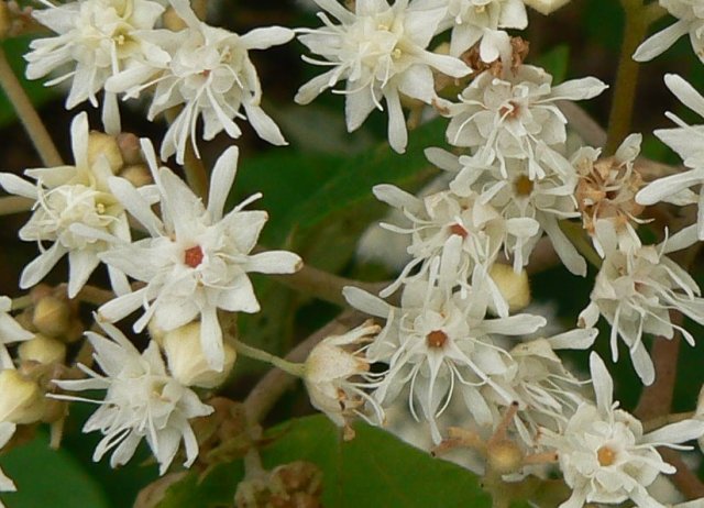 The flowers are white and sweetly scented, reminiscent of honey. They are placed along the top of the horizontal branches in loose clusters, giving a massed bloom effect to the whole shrub. Each individual flower is only 5-7mm in diameter but they are massed in groups, each 3-5cm across. Each flower has five sepals, triangular in shape, five long, skinny, ribbon-like petals that are generally longer than the sepals and another five staminoides; (each three lobed with one vertical and two horizontal lobes), narrow and ribbon-like, as long as the petals but more erect. This arrangement gives a fluffy look to the flowers.