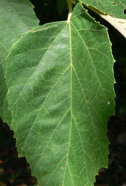The leaves are alternate, simple and variable in shape. Juvenile leaves are broad, jagged and softly hairy, feeling a little like fine, soft velvet, with a fine point at the tip. They are dull on both sides, dark green above, white hairy beneath. Main lateral veins are clearly visible on both sides of the leaf. There are usually five veins, each ending in a larger tooth on mature leaves.