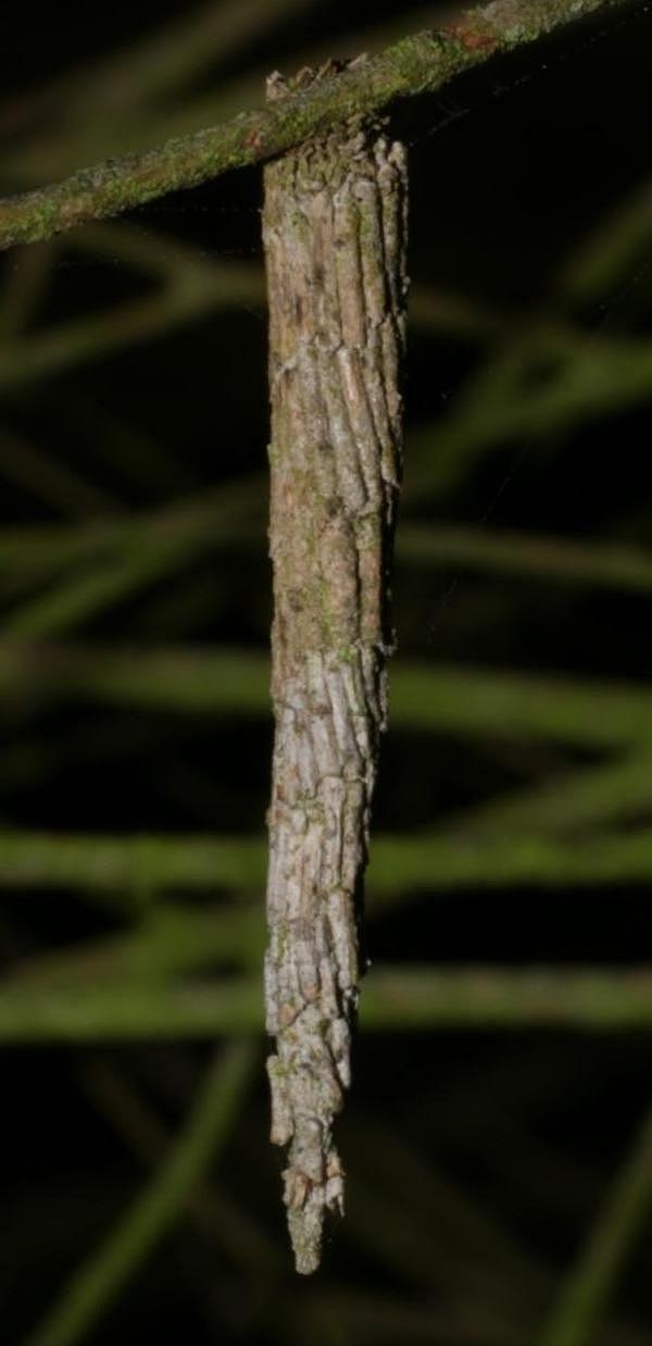 This Caterpillar covers its case with rings of equal length sticks. Each ring is bigger than the previous one, so that the case is tapered to a narrow anal tip, like Lepidoscia arctiella, except that for this speciemen: the rings are slanting, giving a twisted left-handed helical appearance. The case had a length of about 3 cms.