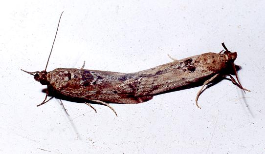 The adult is fawn with faint dark dots and lines on the wings. The moth normally rests with its wings wrapped around its body. The moth has a wingspan of about 2 cms.