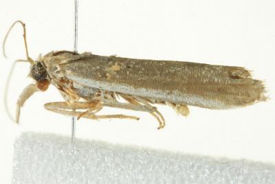 This adult moth has grey or brown forewings with an arc of dark spots edged with orange, near the base, and a white line along the costa. The hindwings are white darkening to brown at the margins. The wingspan is about 2 cms.