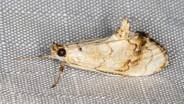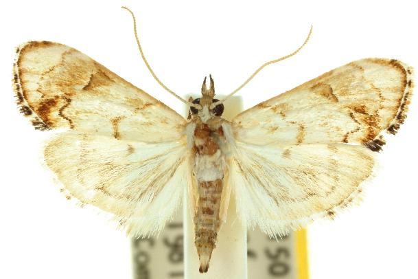 The adults have pale brown forewings, each with a fragmented darker bar across the wingtip. The hindwings are white. The wingspan is about 1.5 cms.