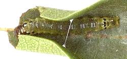 Each caterpillar lives in a shelter made by curling a leaf of its foodplant, and holding it curled with silk.