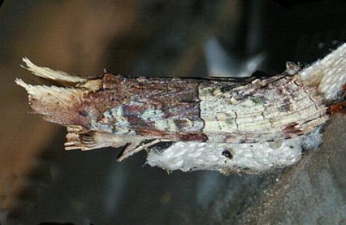 The moth in its resting pose wraps its wings around its body, and erects two large tufts of scales on its head.