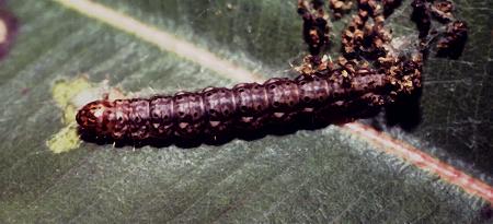 This Caterpillar is brown with sparse hairs, with a brown and black speckled head. It lives on its foodplant in a shelter made of leaves and frass joined together with silk. It feeds on the leaves of: