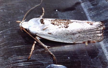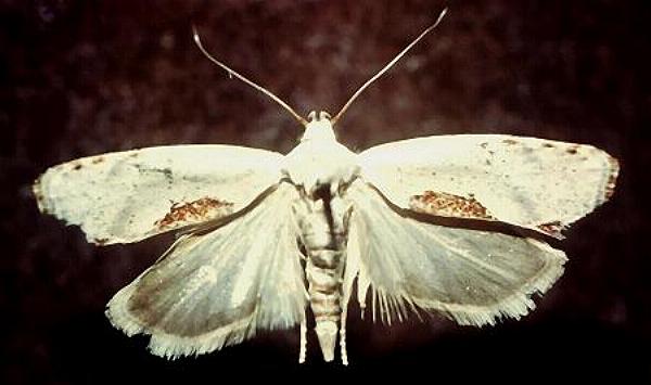 The adult moth is off-white with a vague brown mark on the rear edge of each forewing. The moth can erect a dark crest on the thorax. The moth has a wingspan of about 2 cms.