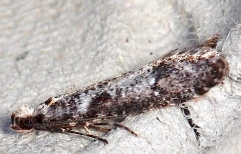 The adult moth has pale grey forewings each with a pattern of dark markings. The hindwings are off-white. Its wingspan is about 2 cms.