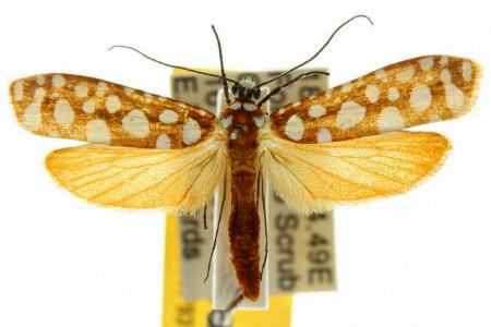 The adult moth has dark orange forewings with white spots. The hind wings are a paler orange colour. Its wingspan is about 3 cms.