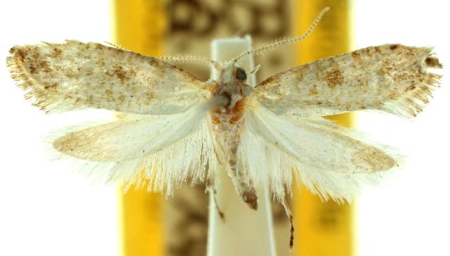 The adult moth has off-white forewings each with brown speckles, including a dark suffused spot near the middle. The hindwings are white shading to brown at the wingtips. Its wingspan is about 1.3 cms.